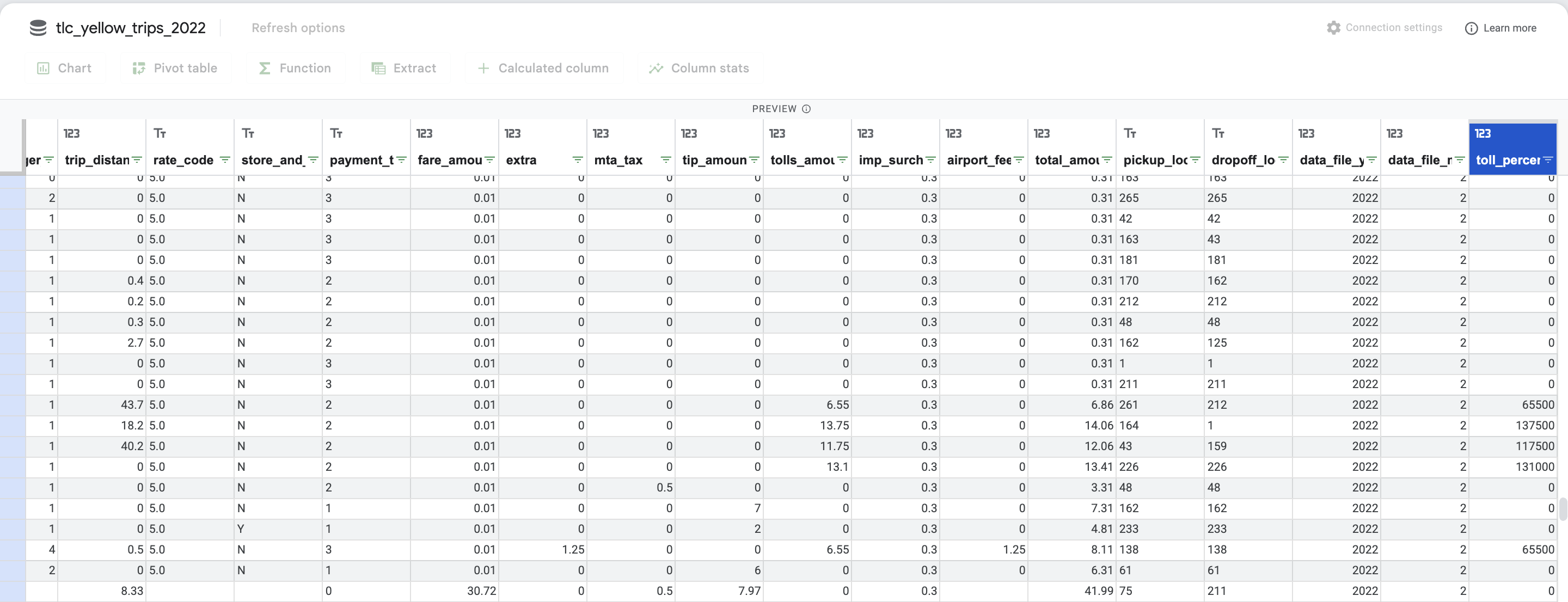 - Calculate a new column that displays the percentage of each fare amount that was used to pay toll fees (based on the toll_amount column).