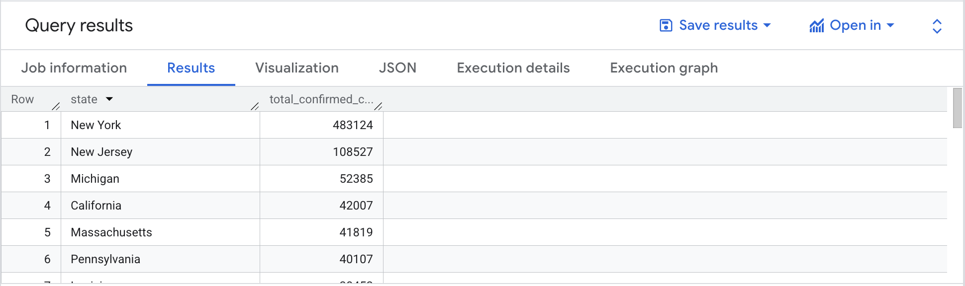 이 질문에 답하기 위한 쿼리를 작성해야 하며, 반환되는 필드는 state 와 total_confirmed_cases 이고, 확진자 수를 기준으로 내림차순 정렬해야 한다.